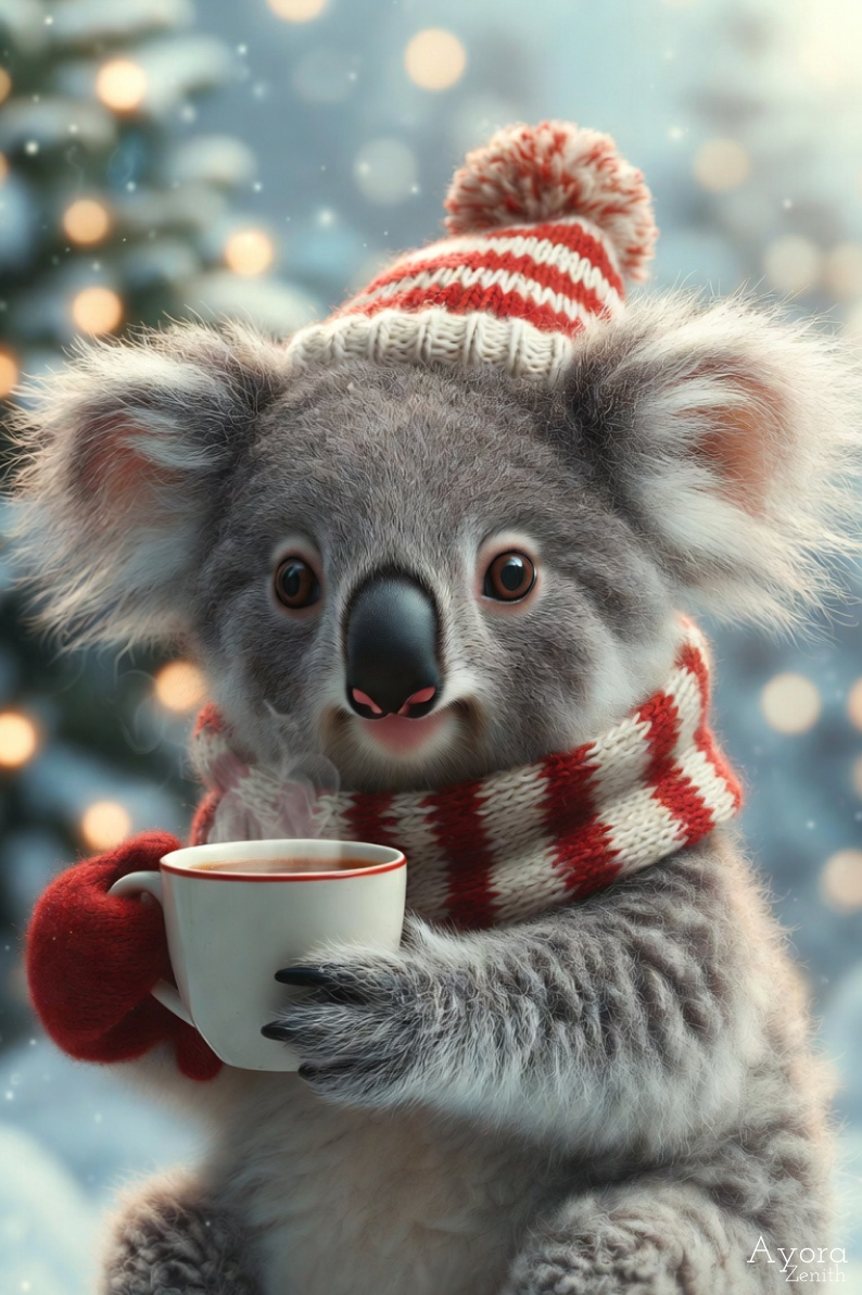 Perfect for animal lovers, winter hygge fans, and seekers of adorable festive art, merry vibes, or heart-melting koala moments.