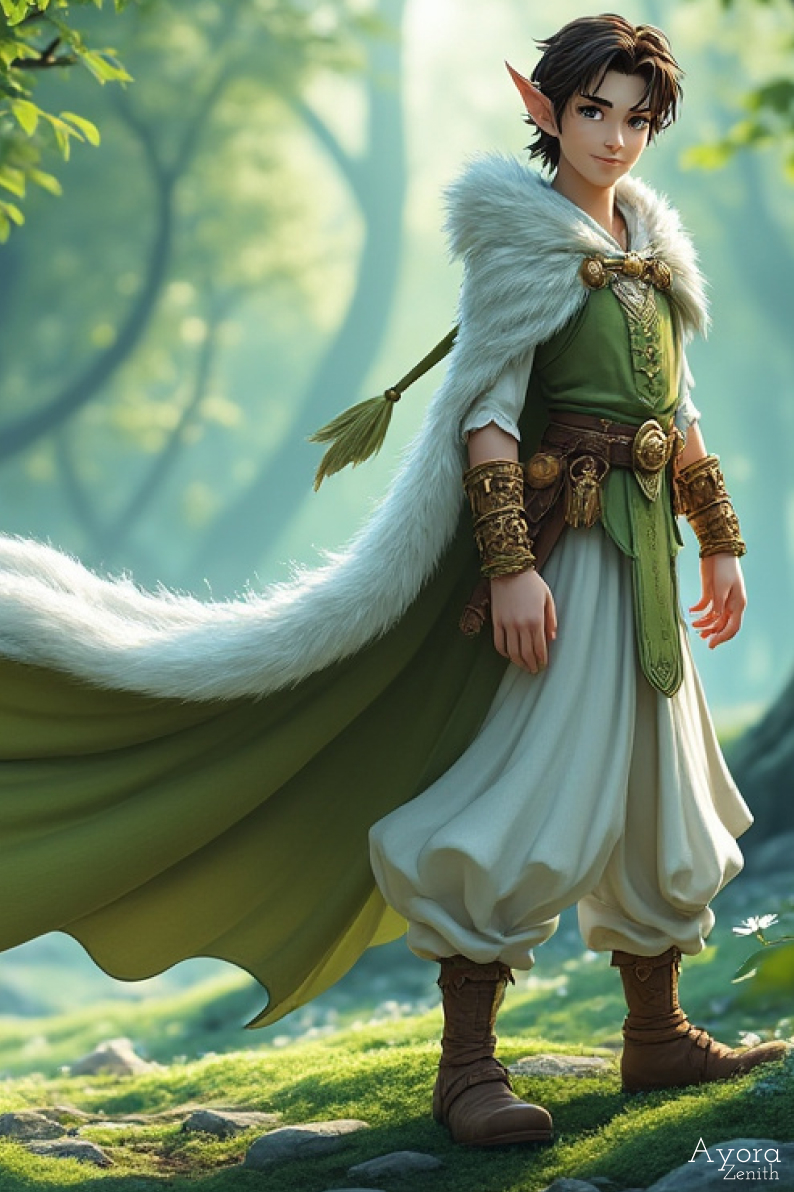 Draped in a luxurious green cloak trimmed with white fur, intricate gold embroidery, and leaf accents, he stands poised in a sun-dappled forest glade surrounded by lush greenery and wildflowers.
